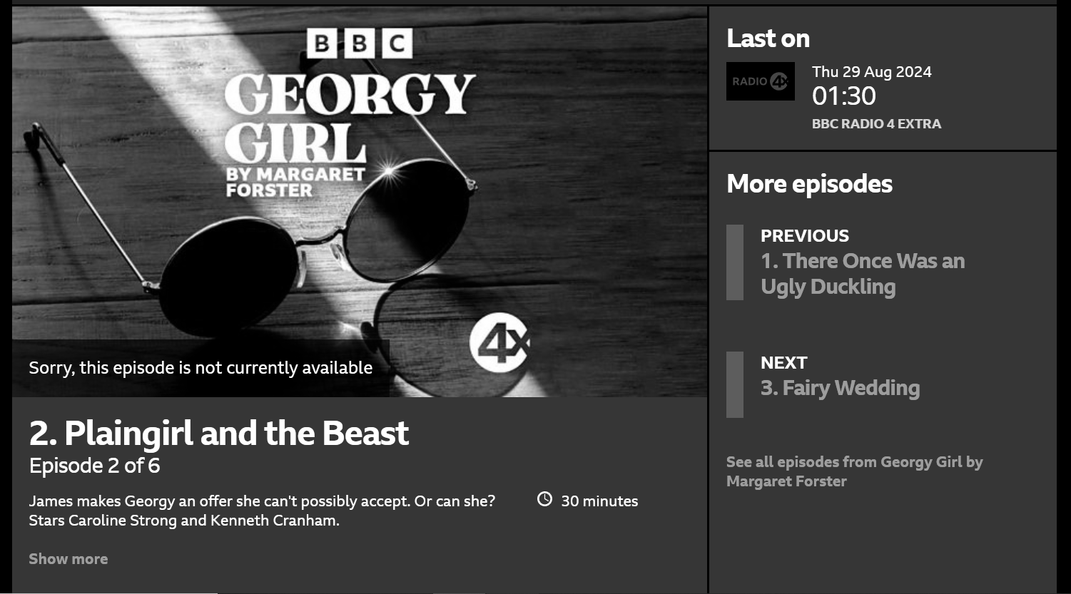 She could also be heard as Georgy in the Radio 4 adaptation of Georgy Girl by Margaret Forster